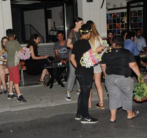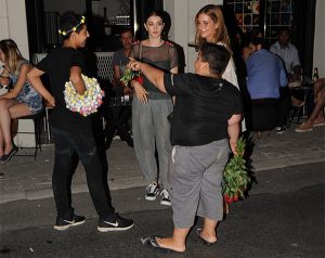 Bir kız arkadaşıyla birlikte yürüyen Burcu Özberk’in etrafını sokak satıcıları sardı.