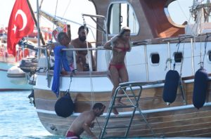 Kiraladığı guletle mavi tura çıkan Muazzez Ersoy teknesinde Oryantel Didem’i misafir etti. Tekne Bitez’de demirleyince Didem kendisini serin sulara bıraktı. Muazzez Ersoy ise gün boyu hiç denize girmedi. Didem fiziğiyle göz doldurdu.
