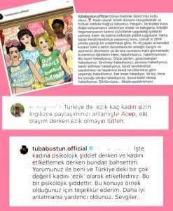 “İşte ‘kadına psikolojik şiddet’ derken ve ‘kadın etiketlemek’ derken bundan bahsettim… Yorumunuz ile beni ve Türkiye’deki bir çok değerli kadını ‘ezik’ olarak etiketlediniz. Bu bir psikolojik şiddettir. Bu konuya örnek olduğunuz için teşekkür ederim. Daha iyi anlatmama yardımcı oldunuz. Sevgiler…”