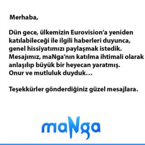 Eurovision Şarkı Yarışması’na Türkiye’nin tekrar katılma ihtimalinin gündeme gelmesinin ardından, 2010 yılında “We Could Be The Same” şarkısıyla yarışmada ikinci olan Manga grubu, twitter hesabından “Eurovision? Yine yeniden…” şeklinde bir paylaşımda bulundu. Bunun üzerine Manga’nın 2018 yılında düzenlenecek yarışmada yeniden Türkiye’yi temsil edeceği iddiaları gündeme geldi. Gruptan yapılan açıklamada ise böyle bir durumun söz konusu olmadığı belirtilerek, kendilerine herhangi bir teklif gelmediği, Eurovision’da Türkiye’yi temsil etmiş bir grup oldukları için böyle bir paylaşımda bulundukları belirtildi.