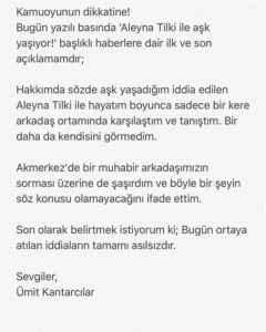 Adı Aleyna Tilki ile aşk dedikodularına karışan Ümit Kantarcılar iddiaları yalanlamıştı. Fakat benzer haberlerin yeniden yapılması üzerine oyuncu sosyal medya hesabından bir açıklamada daha bulundu.İşte Ümit Kantarcılar’ın o açıklamaları: