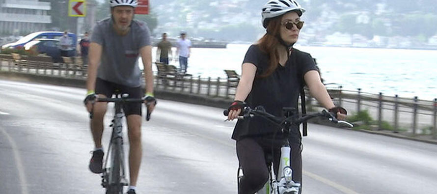 Oyuncu Mine Tugay önceki gün Murat Saygı ile Boğaz’da bisiklete binerken objektife takıldı.