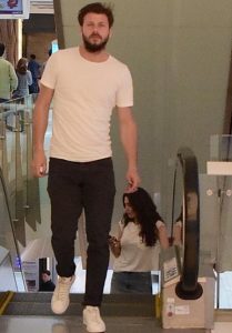 Görüntülenmemek için büyük çaba harcayan oyuncu, görüntüleneceğini anlayınca yürüyen merdivenlerde hızlansa da sevgilisi hemen arkasında objektiflerden kaçamadı.