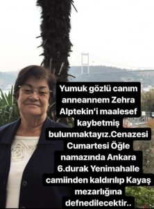 “Yumuk gözlü canım anneannem Zehra Alptekin’i maalesef kaybetmiş bulunmaktayız. Cenazesi cumartesi öğle namazında Ankara 6.Durak Yenimahalle Camii’nden kaldırılıp Kayaş Mezarlığı’na defnedilecektir…”