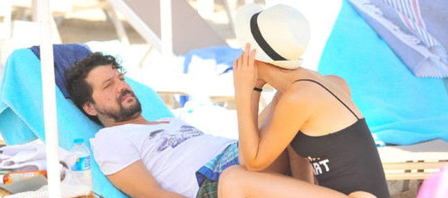 Sevgililer önceki gün kaldıkları otelin plajındaydı. Gün boyu denize girmeyen ve gölgede oturan çift, görüntülendiklerini fark edince gazetecilere arkalarını dönerek telefonla konuşma numarası yaptı.