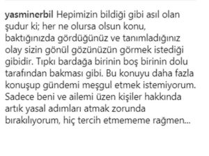 “Hepimizin bildiği gibi asıl olan şudur ki; her ne olursa olsun konu, baktığınızda gördüğünüz ve tanımladığınız olay sizin gönül gözünüzün görmek istediği gibidir. Tıpkı bardağa birinin boş birinin dolu tarafından bakması gibi. Bu konuyu daha fazla konuşup gündemi meşgul etmek istemiyorum. Sadece beni ve ailemi üzen kişiler hakkında artık yasal adımları atmak zorunda bırakılıyorum, hiç tercih etmememe rağmen…”