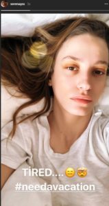 Magazin Şubat 8, 2018 YORGUN SERENAY! Serenay Sarıkaya’nın Instagram paylaşımı dikkat çekti. Serenay Sarıkaya Instagram’ın hikaye bölümünden bir paylaşımda bulundu. “Yorgun” olduğunu belirten oyuncunun makyajsız olması da dikkatlerden kaçmadı.